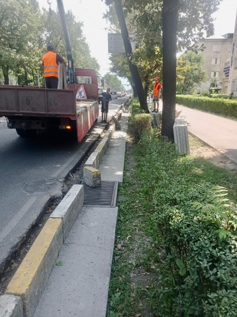 «Бишкекасфальтсервис» муниципалдык ишканасынын бригадасы Манас проспектисиндеги Москва жана Токтогул көчөлөрүнүн ортосундагы жол бордюрларын оңдоодо.
