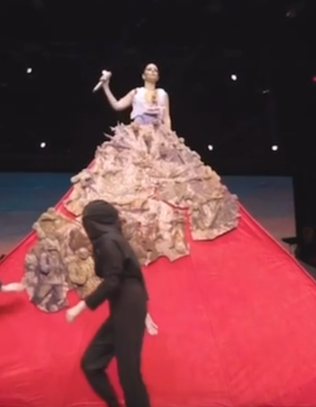 Симге Сагын атайын даярдалган символикалык көйнөгүн ырдап жаткан учурда театрлаштырылган даярдык менен кийип, согуш жана Жеңиш майрамын чагылдырган символикалык көрүнүштү көрүүчүлөргө тартуулаган. Ырчынын бул көйнөгү 1 айда даярдалган. Кеченин жүрүшүндө ырчы«10 жыл» гимнин аткарып командасы менен биргеликте жагымдуу маанай тартуулаган.