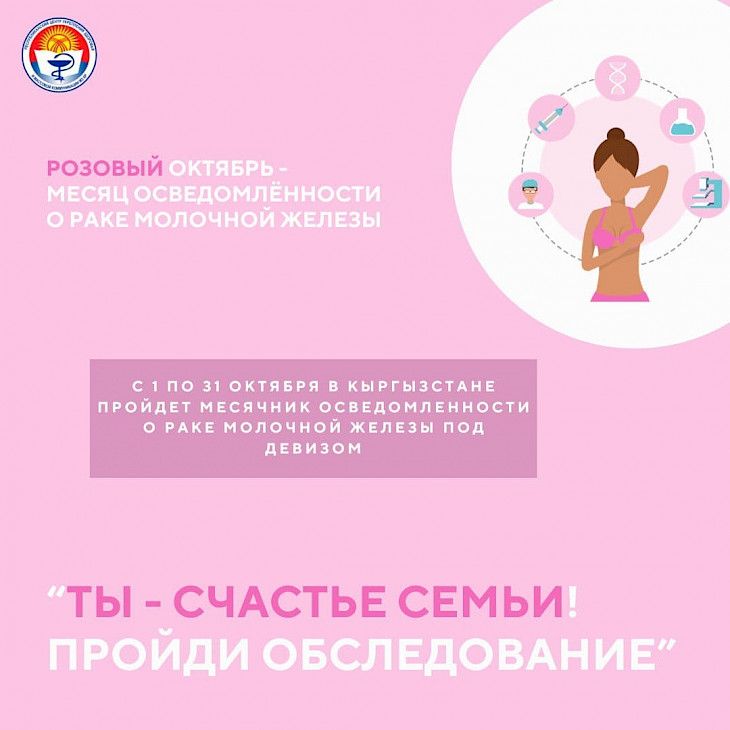Маалыматка ылайык, аялдардын ден соолугун коргоо жана чыңдоо, эмчек рагын алдын алуу жана алардын өнүгүүсүнүн коркунучтуу факторлорун азайтуу максатында Кыргызстанда 1-октябрдан 31-октябрга чейин «Сен үй-бүлөнүн бакытысысыз! Текшерүүдөн өтүңүз!» деген ураан алдында эмчек рагы боюнча түшүндүрүү айлыгы жарыяланды.