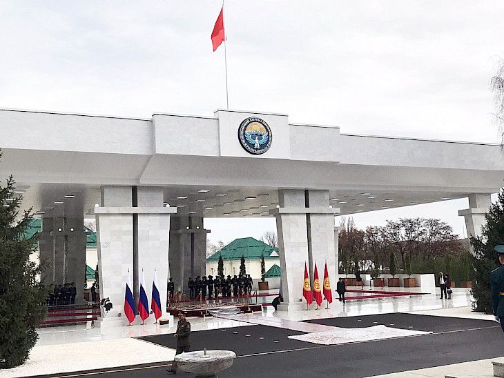 «Ала-Арча» мамлекеттик резиденциясында мрамор чатырдын астында Кыргызстан жана Россиянын мамлекеттик желектери илинип, Ардактуу кароол тизилип, килемдер төшөлдү.