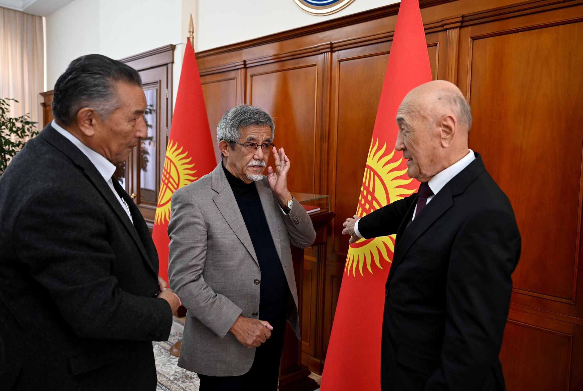 Бүгүн, 24-октябрда Жогорку Кеңештин Төрагасы Нурланбек Шакиев мамлекеттик жана коомдук ишмер Медеткан Шеримкулов, Кыргыз Республикасынын мамлекеттик туусунун авторлору Жусуп Матаев жана Бекбосун Жайчыбековдор менен жолугушуп, башкы мамлекеттик символду өзгөртүүгө байланышкан сунуштарын укту.
