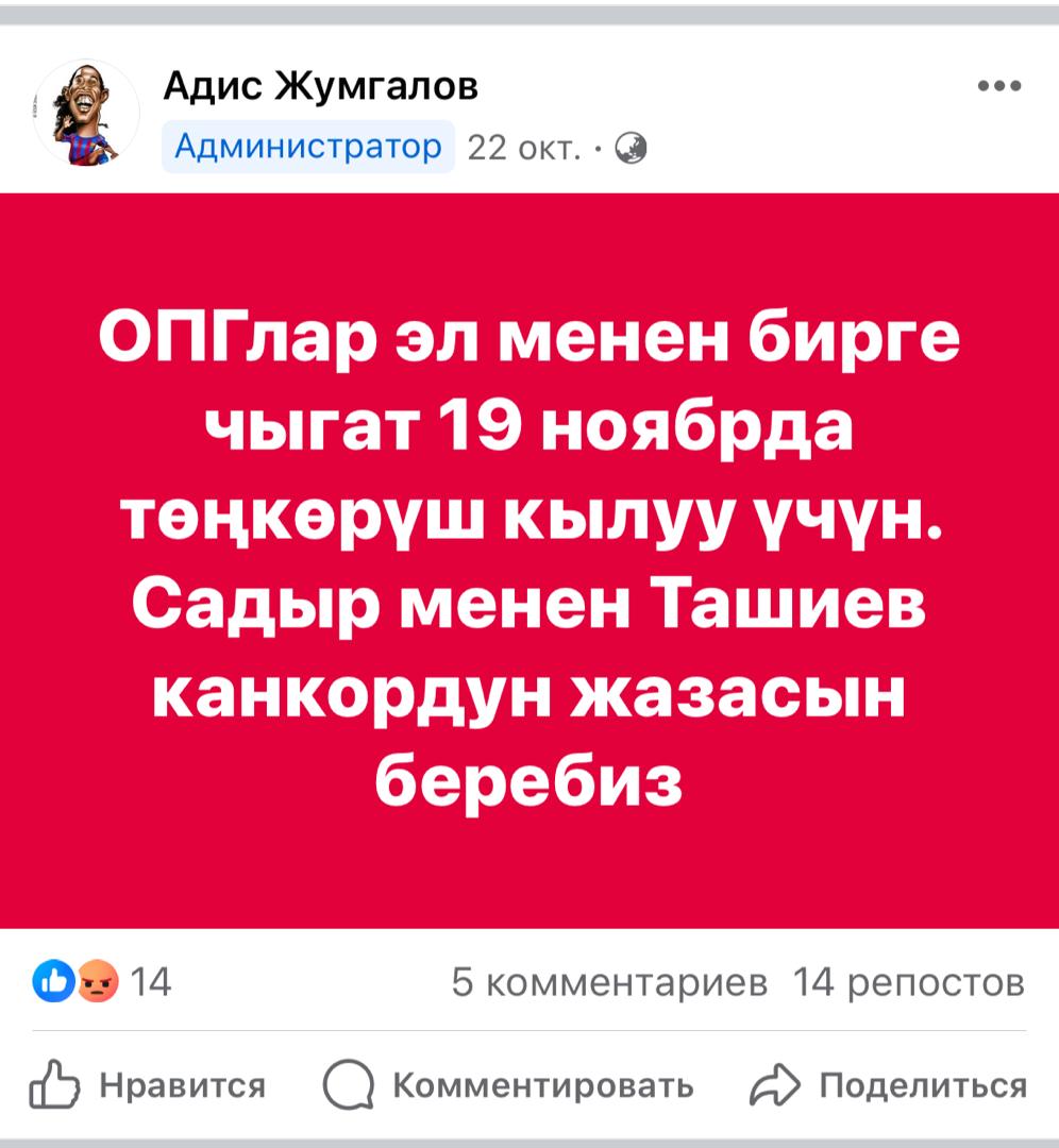 КР Кылмыш-жаза кодексинин 278-беренеси (“Массалык баш аламандык”) боюнча козголгон кылмыш ишинин алкагында көрүлгөн ыкчам-иликтөө иш-чараларынын жүрүшүндө массалык баш аламандыкка жана бийлик өкүлдөрүнүн мыйзамдуу талаптарына баш ийбөөгө чакырыктарды такай жарыялап турган “Фейсбук” социалдык тармагындагы “Адис Жумгалов” аккаунтунун колдонуучусу – 1980-жылы туулган КР жараны М.А.Р. аныкталып, кармалды.УКМКнын берген маалыматына караганда, ал өз аракети үчүн жоопкерчиликтен кутулуу үчүн колдонуучу М.А.Р. купуялык орнотуп алган, б.а. “Фейсбук” социалдык тармагындагы фейк аккаунтун колдонгон.Ыкчам издөө иш-чараларынын жүрүшүндө М.А.Р.нын жашаган жеринде 4 даана мобилдик уюлдары, 1 даана персоналдык компьютер, 2 даана ок атуучу куралдар жана ага ок-дарылар, ошондой эле кылмыш иши үчүн мааниси бар башка буюм далилдери табылып алынды.Учурда ыкчам-иликтөө иш-чаралары жүргүзүлүүдө.