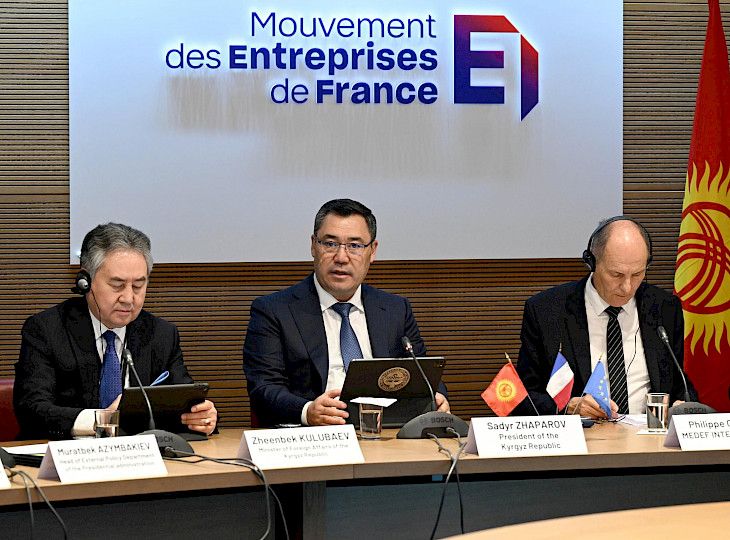 Президент Садыр Жапаров Париж шаарына болгон иш сапарынын алкагында биринчи кыргыз-француз бизнес-форумуна катышты.Иш-чарага Кыргызстандын жана Франциянын логистика, финансы, туризм, агроөнөр жай комплекси, ЭКБ, IT-технологиялар, текстиль өндүрүшү ж. б. тармактарындагы 50дөн ашык компаниялардын ишкерлери катышууда.Форумдун катышуучулары менен саламдашып жатып, Мамлекет башчысы «МЕДЕФ Интернасионалдын» башкы директору Филипп Готьеге дүйнөнүн кооз шаарларынын бири – Парижде кыргыз делегациясына көрсөткөн меймандостугу үчүн ыраазычылык билдирди.Садыр Жапаров бул бизнес-аянтча Кыргызстан менен Франциянын ортосундагы эки тараптуу кызматташтыкты мындан ары өнүктүрүүгө өбөлгө түзөрүн канааттануу менен белгиледи.«Биз өлкөлөр ортосунда түзүлгөн достук мамилелерибизди жогору баалайбыз. Бүгүнкү Форум, албетте, тараптардын мындан ары экономикалык кызматташтыкты арттыруу ниеттерин ачыктап турат. Биздин мамилелерибизге мындан да маңыздуу жана практикалык мүнөз берүүгө убакыт келип жетти. Бүгүнкү жолугушуу биздин ишкерлерге бизнес өнөктөштүктү өнүктүрүү үчүн жаңы мүмкүнчүлүктөрдү сунуштайт деп ишенем», — деп белгиледи ал.Мамлекет башчысы Кыргызстан уникалдуу соода магистралынын – Улуу Жибек жолунда жана Европа менен Азиянын ортосунда жайгашканын белгиледи. Соода жолдорунда пайдалуу географиялык жайгашуусу менен биздин өлкө Чыгыш менен Батыштын ортосундагы көпүрө боло алат.Бул контекстте Садыр Жапаров азыркы учурда «Кытай – Кыргызстан – Өзбекстан» темир жолун куруу боюнча долбоор активдүү иштеп чыгуу стадиясында экенин баса белгиледи. Ошону менен бирге Кытай – Кыргызстан – Өзбекстан – Түркмөнстан – Азербайжан – Европа багыты боюнча «Түштүк транспорттук коридорунун» маршруту иштелип чыгууда.Президент Кыргызстандан Франциянын рыногуна органикалык азыктарды экспорттоо, анын ичинде ВСП+линиясы боюнча экологиялык жактан таза продукцияны экспорттоо мүмкүнчүлүктөрүн белгиледи. Ошону менен бирге ал Кыргызстандагы масштабдуу реформаларды, инвесторлор үчүн жагымдуу шарт түзүлүп , чет өлкөлүк түз инвестициялардын агымы көбөйгөнүн айтты.«Биз Франциянын агроөнөр жай комплексине жаңы технологияларды киргизүү боюнча тажрыйбасына кызыкдарбыз, ошондой эле биргелешкен агроөнөр жай ишканаларын түзүү боюнча француз компанияларынын сунуштарын кароого даярбыз. Биз Франциянын туристтик индустриясынын өнүгүү деңгээлине суктанабыз», — деп, Садыр Жапаров аталган тармактагы долбоорлорду ишке ашырууда, ошондой эле «таза » энергетиканы ишке киргизүүдө активдүү кызматташууга чакырды.Сөзүнүн соңунда президент Садыр Жапаров Франциянын ишкер чөйрөлөрү кыргыз ишкерлери менен активдүү кызматташып, тил табышып, жакынкы келечекте масштабдуу долбоорлорду ишке киргизүүсүнө басым жасады.