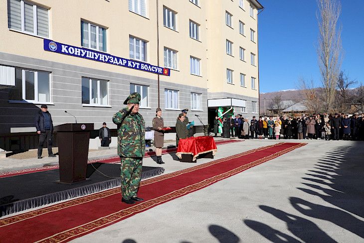 Бүгүн Улуттук коопсуздук мамлекеттик комитетинин Талас облусундагы кызматкерлерине жана УКМКга караштуу чек ара кызматынын аскер кызматчыларына кызматтык үйлөр берилди.Атайын кызматтан кабарлашкандай, жаңы батирлердин ачкычын УКМК төрагасы Камчыбек Ташиев тапшырды.Салтанаттуу иш-чарага жергиликтүү бийлик өкүлдөрү, УКМК ардагерлери, тийиштүү кызматтын өздүк курамы, чек ара кызматынын аскерлери жана алардын үй-бүлө мүчөлөрү катышты.Беш кабаттан турган 35 батирдин, 19у УКМК кызматкерлерине, ал эми 16сы чек ара кызматынын аскер кызматчыларына берилди.Өз кезегинде Камчыбек Ташиев коопсуздук кызматкерлерин жана алардын үй-бүлө мүчөлөрүн жаңы конуштуу болуусу менен куттуктап, аларга көрүлүп жаткан камкордуктун баары президент Садыр Жапаровдун тапшырмасынын негизинде жүргүзүлүп жатканын белгиледи. Ошондой эле жалпы өлкө боюнча, анын ичинде Талас облусунда УКМК кызматкерлери үчүн тийиштүү шарттар түзүлүп, райондогу ар бир имарат жаңыланганын маалымдады.Аны менен катар төрага күч түзүмдөрүнүн кызматкерлеринин айлык акылары көтөрүлүп, алардын материалдык- техникалык базасы чыңалганын кошумчалады. Андыктан ар бир кызматкерди мекен коопсуздугу, элдин бейпил турмушу үчүн ак дилден кызмат өтөөгө чакырды.Белгилей кетсек, көп кабаттуу турак жайдын курулушу 2022-жылдын октябрь айында башталган. Жалпы аянты 3992 м2 түзөт.
