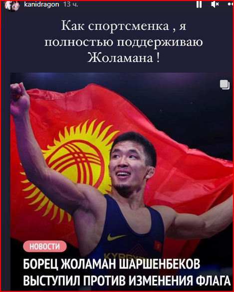 «Спортчу катары мен Жоламан Шаршенбековду колдойм. Күнү-түнү бул желек менен жашап, ушул желек менен ар бир жолубузду пландап келгенбиз. Мен жаңы желекти тааныгым келбей жатат», — деп жазды ал социалдык тармактагы баракчасына.