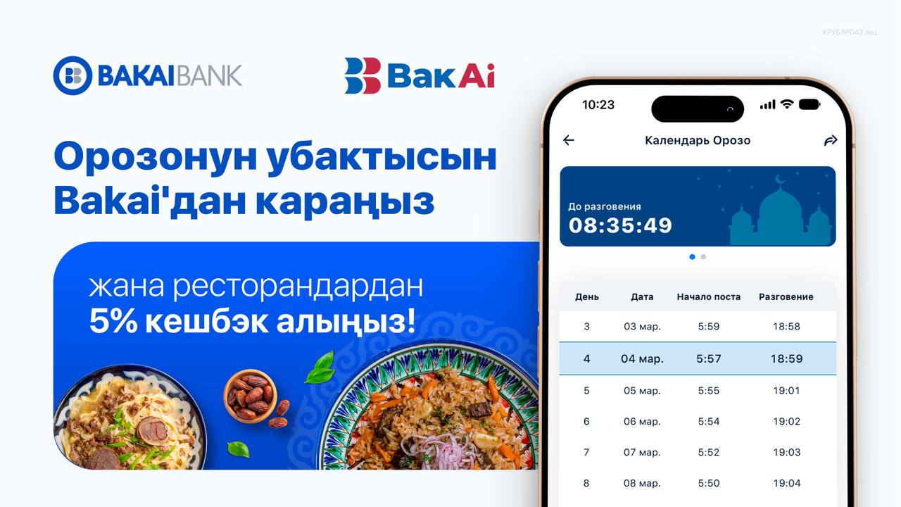 Бакай Банк ыйык Орозо айында кардарлары үчүн өзгөчөбелек камдады! Эми BakAi мобилдик тиркемесиндеыңгайлуу Орозо-2025 календары жеткиликтүү, ошондойэле Орозо ай ичинде ресторан, кафелерден сатыпалууларга жогорулатылган 5% кешбэк берилет.Жаңы календарда эмнелер жазылган?• Бардык калктуу аймактар үчүн ооз бекитүү мененооз ачуу убактылары. Эми аны интернеттен издеп убакыткоротпойсуз.• Эске салуу – орозонун убактысын өткөрүп жибербөөүчүн• Ооз ачуу жана бекитүүдөгү […]
