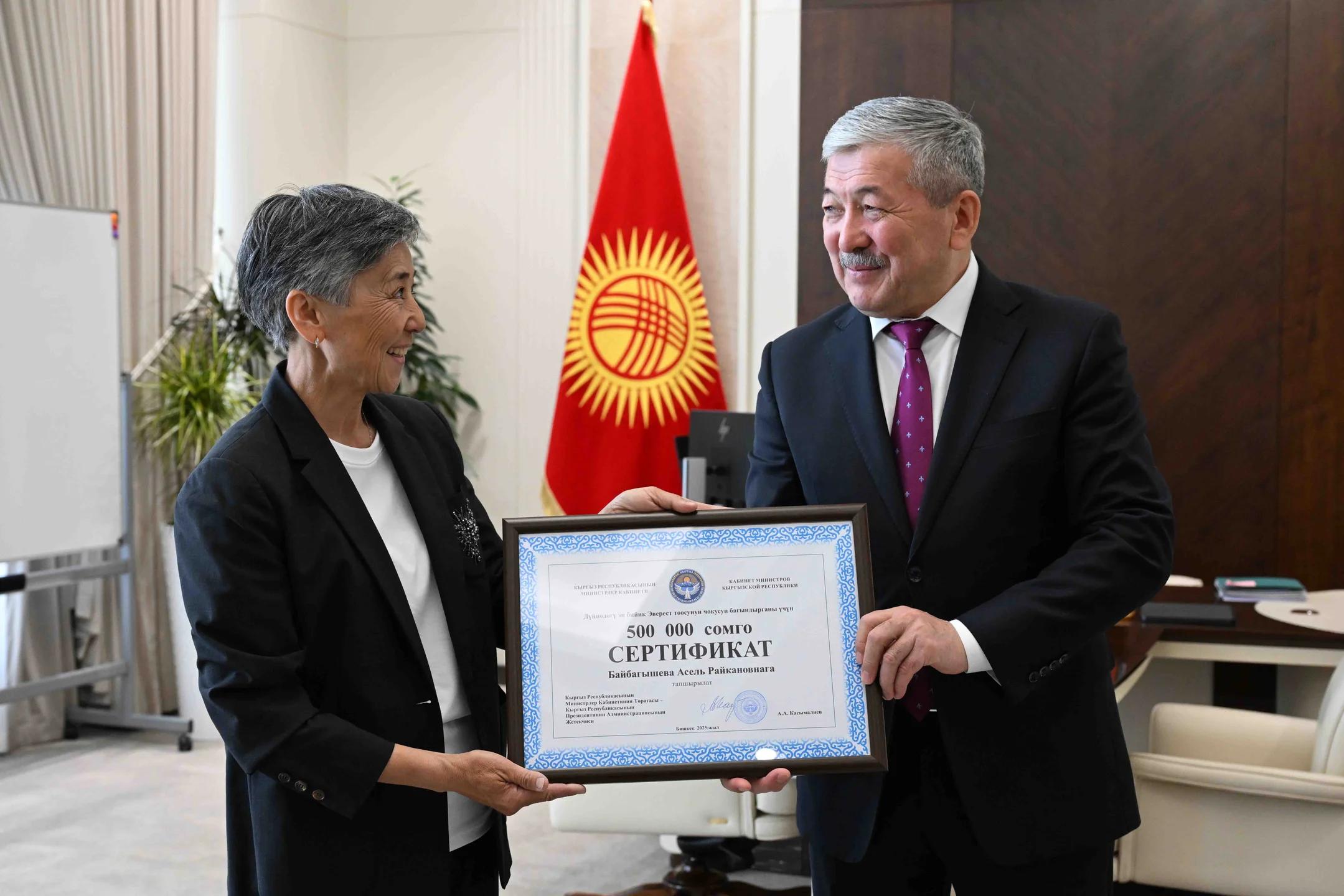 Жолугушуунун жүрүшүндө өкмөт башчы Асел Байбагышеванын өзгөчө жетишкендигин терең баалап, колдоо көрсөтүп, ага 500 миң сомдук сертификат тапшырды.