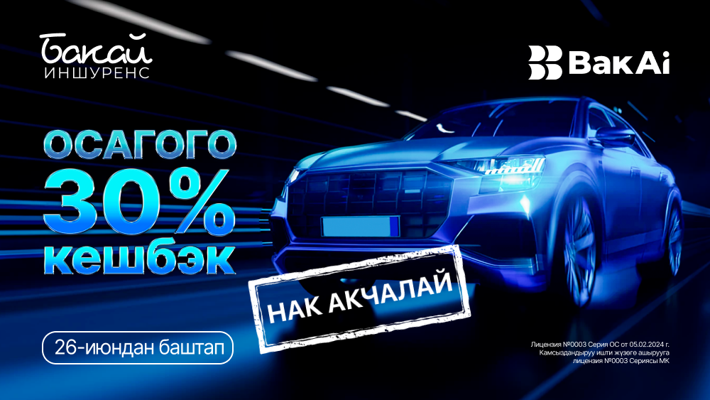 2025-жылдын 26-июнунан 30-сентябрга чейин Bakai Bank’тын ар бир кардары BakAi тиркемесинен милдеттүү ОСАГО полисин тариздеп, 30% нак акчалай кешбэкке ээ боло алышат!ОСАГО — бул автоунаа ээлеринин каржылык тобокелдиктер жана жол кырсыктары жаралган учурдагы жарандык-укуктук жоопкерчилигин милдеттүү камсыздандыруу. Эгер сиз жол кырсыгынын себепкери болуп калсаңыз, камсыздандыруу компаниясы жабырлануучу тараптын чыгымын төлөп берет, тактап айтканда сиз чыгымды өз чөнтөгүңүздөн чыгарбайсыз.2025-жылдан тарта полиси жок айдоочулар үчүн айып пул каралган. Ошондуктан ОСАГО полисин тариздөө — жоопкерчилик гана эмес, пайдалуу муктаждык болуп да саналат.Акциянын шарттары:• BakAi мобилдик банкы аркылуу ОСАГОну тариздөөдө, кардар полистин баасынан 30% кешбэкке ээ болот;• Кешбэк сиздин эсебиңизге реалдуу акча менен (бонус эмес) дароо келип түшөт;• Акциянын алкагында полис тариздеген бардык колдонуучулар катышуучу боло алышат;• Сунуш Bakai Insurance өнөктөшүнөн таризделген полистер үчүн жеткиликтүү.ОСАГОну кантип тариздейсиз: