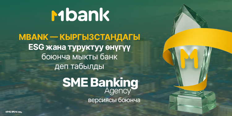 SME Banking Agency агенттигинин эксперттик баалоосунун жыйынтыгында MBANK Кыргызстандагы ESG тармагындагы мыкты банк деп табылып, жогорку жоопкерчилик деңгээлин жана ESG ыкмасын практикалык түрдө жүзөгө ашырууну көрсөтө алды.