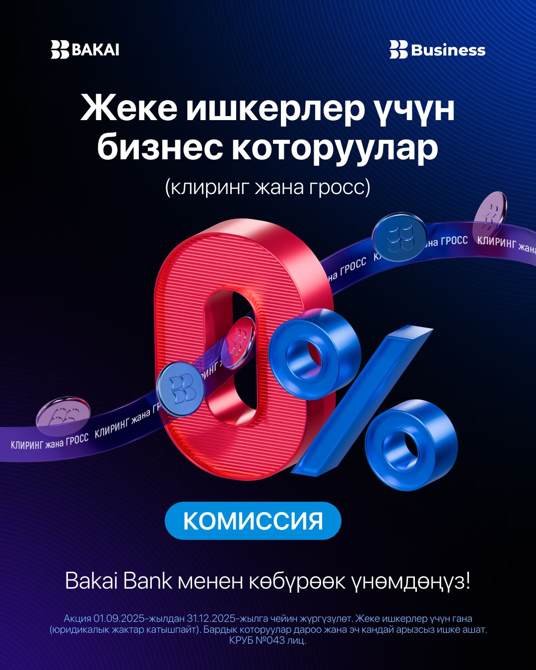 2025-жылдын 1-сентябрынан 31-декабрына чейин жеке ишкерлер Bakai Business аркылуу Клиринг жана Гросс-төлөмдөрдү комиссиясыз ишке ашыра алышат.