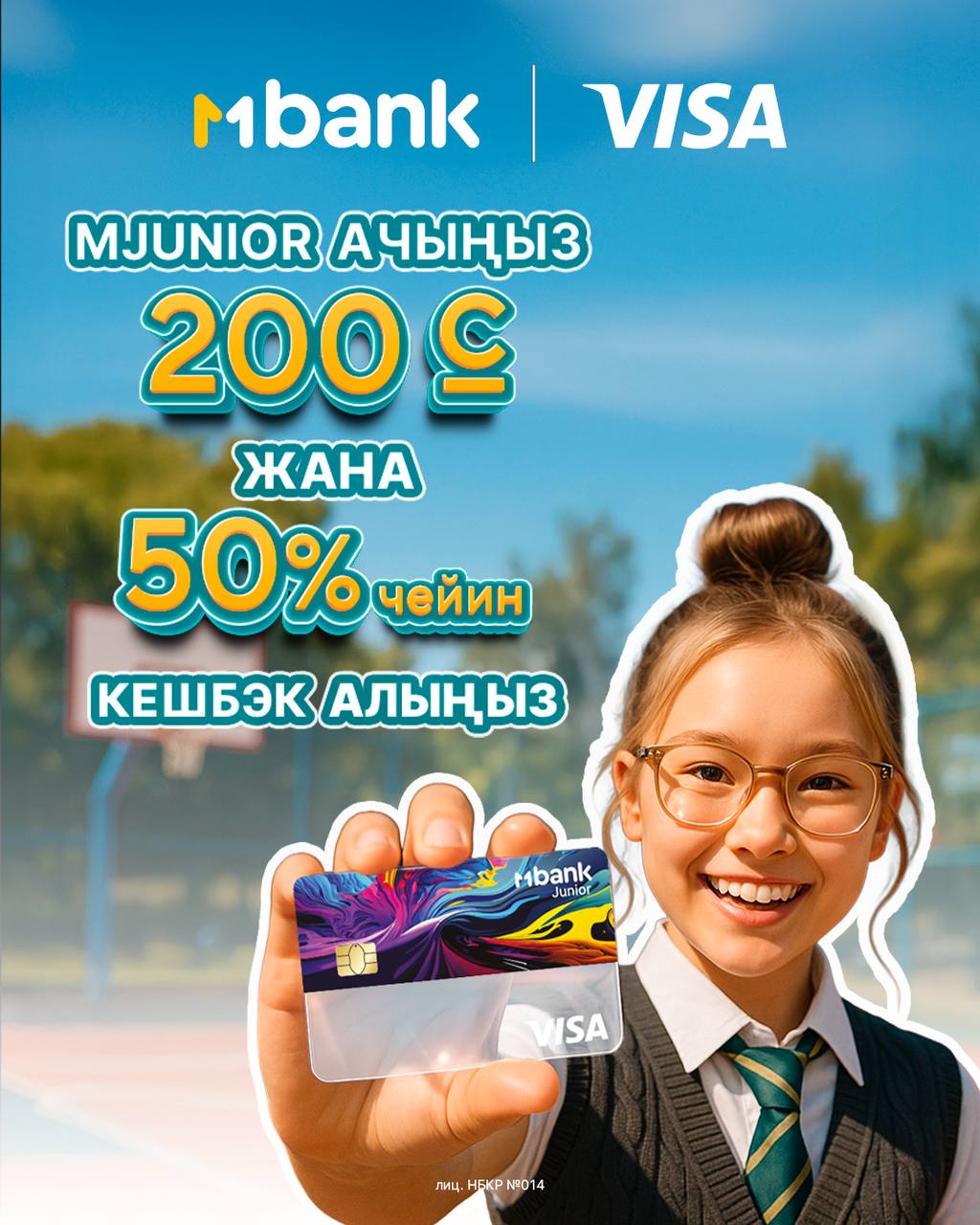 MBANK эл аралык төлөм системасы Visa менен биргеликте MJunior балдар картасынын ээлери үчүн акциянын башталышын жарыялайт!MJunior картасын ачыңыз, коопсуз жана ыңгайлуу төлөмдөрдү жасаңыз жана бонус алыңыз: эсебиңизге 200 сом жана сатып алууларга 50% чейин кешбэк!