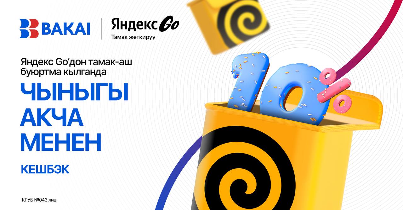Эми сүйүктүү тамактарыңыз мурдагыдан да даамдуу жанапайдалуу болот. 2025-жылдын 1-сентябрынан 30-ноябрына чейин BAKAI’дын Visa карталарынын ээлери “Яндекс Еда” сервисинен буюртма бергенде 10% өлчөмүндө чыныгы акчаменен кешбэк ала алышат. Кардар эмне алат?“Яндекс Едадан” Visa картасы аркылуу төлөнгөн ар бирбуюртманын 10%ы чыныгы акча менен түз эле кардардынкартасына кайтарылат. Бул бонус же упай эмес, булкаалаган убакта пайдалана ала […]